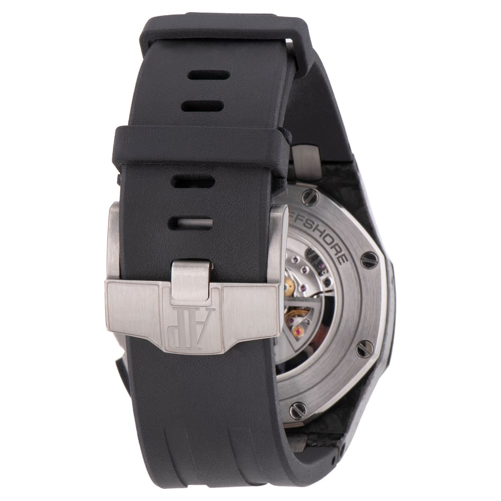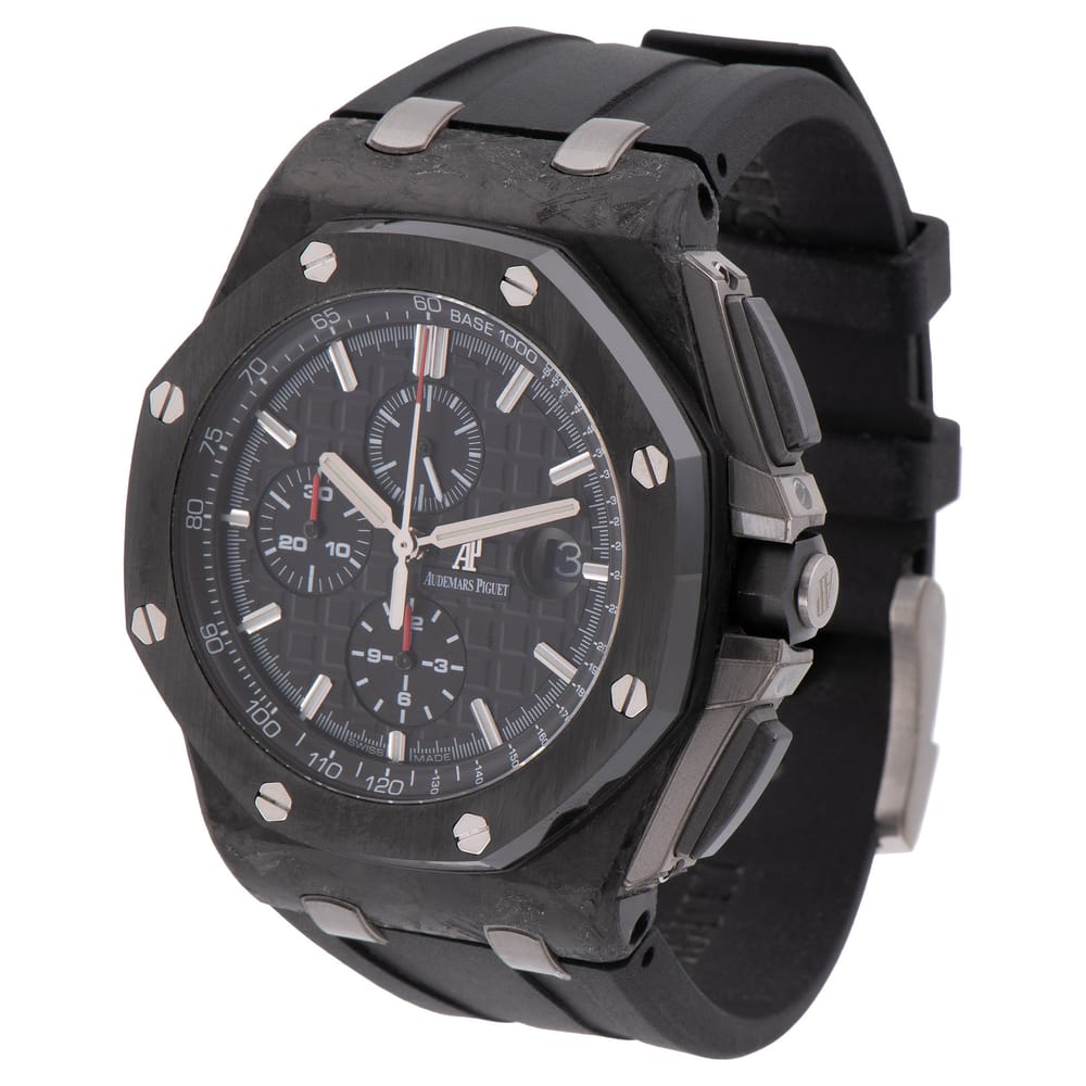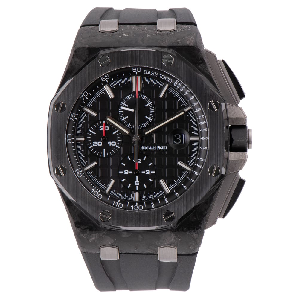 Discover the highly coveted Audemars Piguet Royal Oak Offshore Chronograph, a perfect blend of luxury and performance. With a robust 44.00 mm forged carbon case in a matte marbled black and dark grey finish, this timepiece is both striking and resilient. It features a sleek black dial complemented by a functional chronograph and an automatic movement with a 50-hour power reserve, adding functionality to its sporty appeal. This pre-owned watch is in excellent condition, making it a great addition to any discerning collection.
