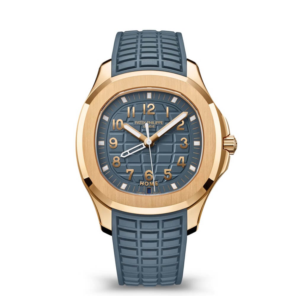 Patek Philippe presents the Aquanaut Travel Time Reference 5269 in a new, non gem-set rose gold version featuring a highly refined color. The opaline blue-gray dial is echoed by an integrated strap in matching composite material, secured by a patented Patek Philippe fold-over clasp featuring four independent safety catches. Equipped with an exclusive quartz caliber, this travel watch with its “contemporary casual chic” style is distinguished by its Travel Time display with a practical and discreet crown-operated setting system.
