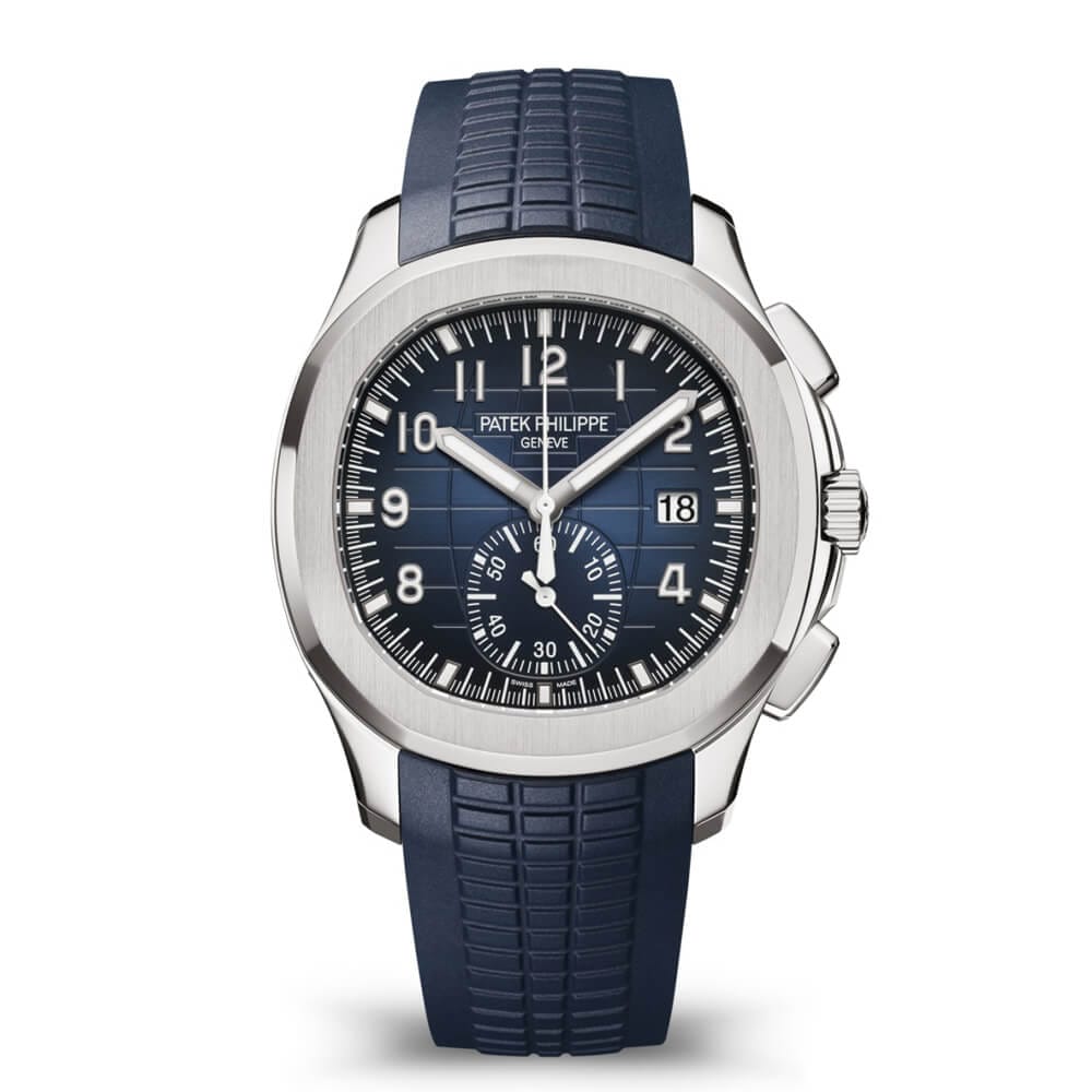 Patek Philippe is reasserting the “contemporary casual chic” spirit of the Aquanaut flyback chronograph with the first white gold version of this self-winding model, combined with an elegant midnight blue color for the dial and matching composite strap. The dial is enlivened by a black-gradient rim. Water-resistant to 30 m, the case is enhanced by polished and satin finishes. The 60-minute counter at 6 o’clock picks up the rounded octagonal shape of the bezel. The patented fold-over clasp is secured by four independent catches.