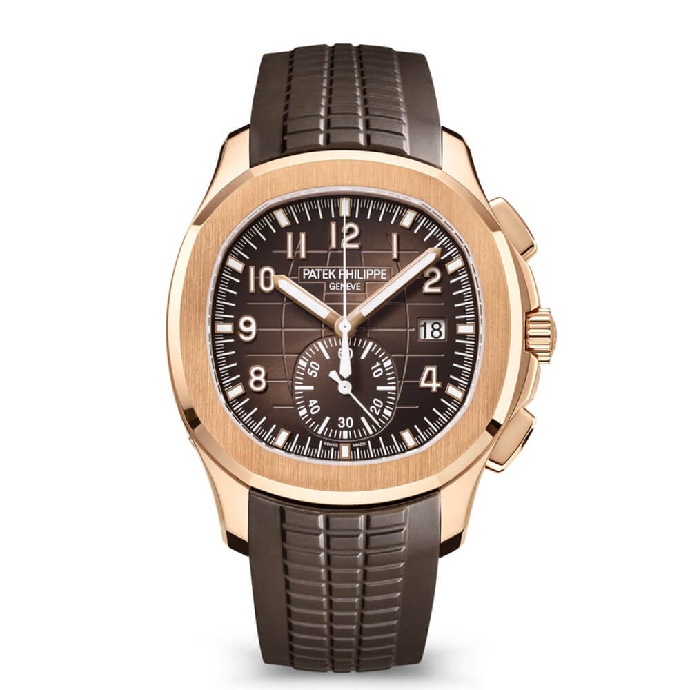 Patek Philippe revisits the sporty style of the Aquanaut chronograph in a rose gold version, paired with a sunburst brown dial featuring a black-gradient rim and matching composite strap. The original design of the case (water-resistant to 30 m) and the bezel is highlighted by the alternating polished and satin-brushed finishes. The self-winding flyback chronograph movement combines tradition (column wheel drive) with innovation (vertical disk clutch). Since the clutch causes almost no wear, the central chronograph seconds hand can also be used to display the seconds continuously.