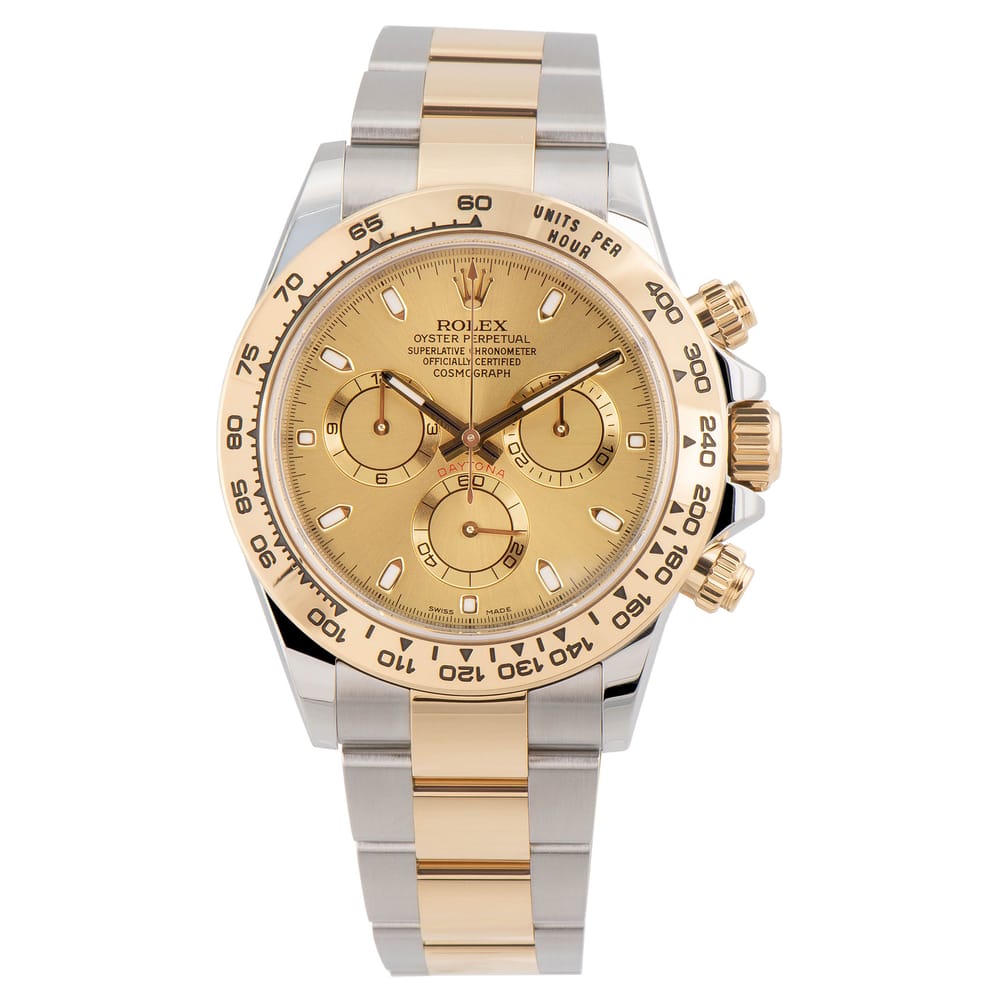 This Rolex Cosmograph Daytona showcases timeless elegance with a sophisticated two-tone Yellow Rolesor case. Featuring a striking champagne dial, this 40mm watch is powered by the reliable automatic Caliber 3186 movement, boasting an impressive 72-hour power reserve. The fixed bezel and sapphire crystal enhance its robust design, suitable for both sport and formal occasions. Available in excellent used condition, it’s a remarkable addition for any discerning watch collector.