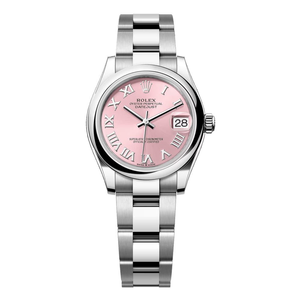 This Oyster Perpetual Datejust 31 in Oystersteel features a pink dial and an Oyster bracelet.
