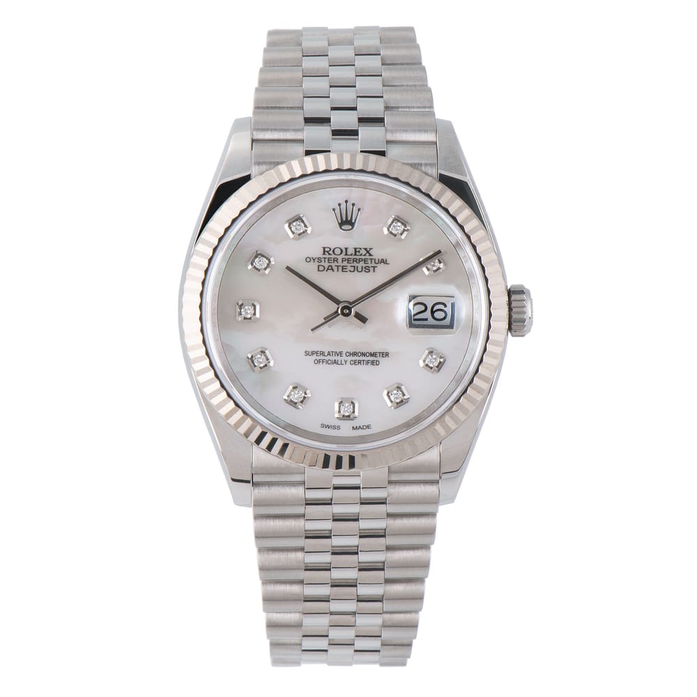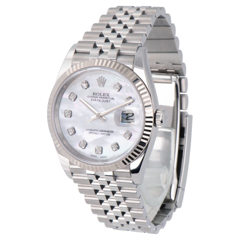 Experience the elegance of the Rolex Datejust 126234, a remarkable 36.00 mm watch crafted in luxurious 18K white gold. The immaculate white dial features a fluted bezel, offering both sophistication and functionality with a date complication and a 70-hour power reserve. In excellent used condition, this timepiece is both stylish and practical for everyday wear, suitable for any unisex wardrobe. Please note that the watch comes with papers only for verification, ensuring authenticity from the esteemed brand Rolex.