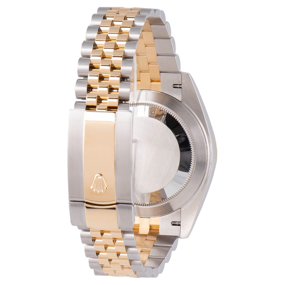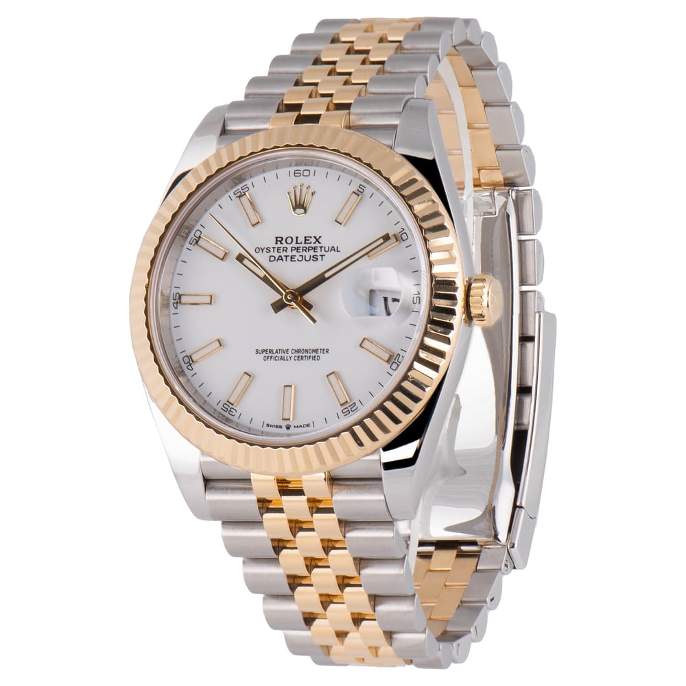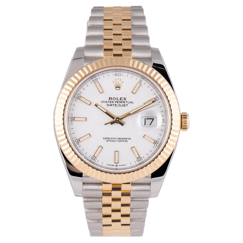 This Oyster Perpetual Datejust 41 in Oystersteel and yellow gold features a white dial and a Jubilee bracelet.