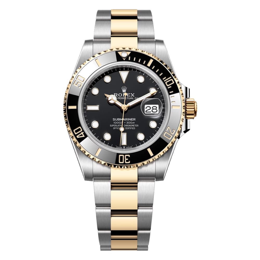 The Oyster Perpetual Submariner Date in Oystersteel and yellow gold with a Cerachrom bezel insert in black ceramic and a black dial with large luminescent hour markers.