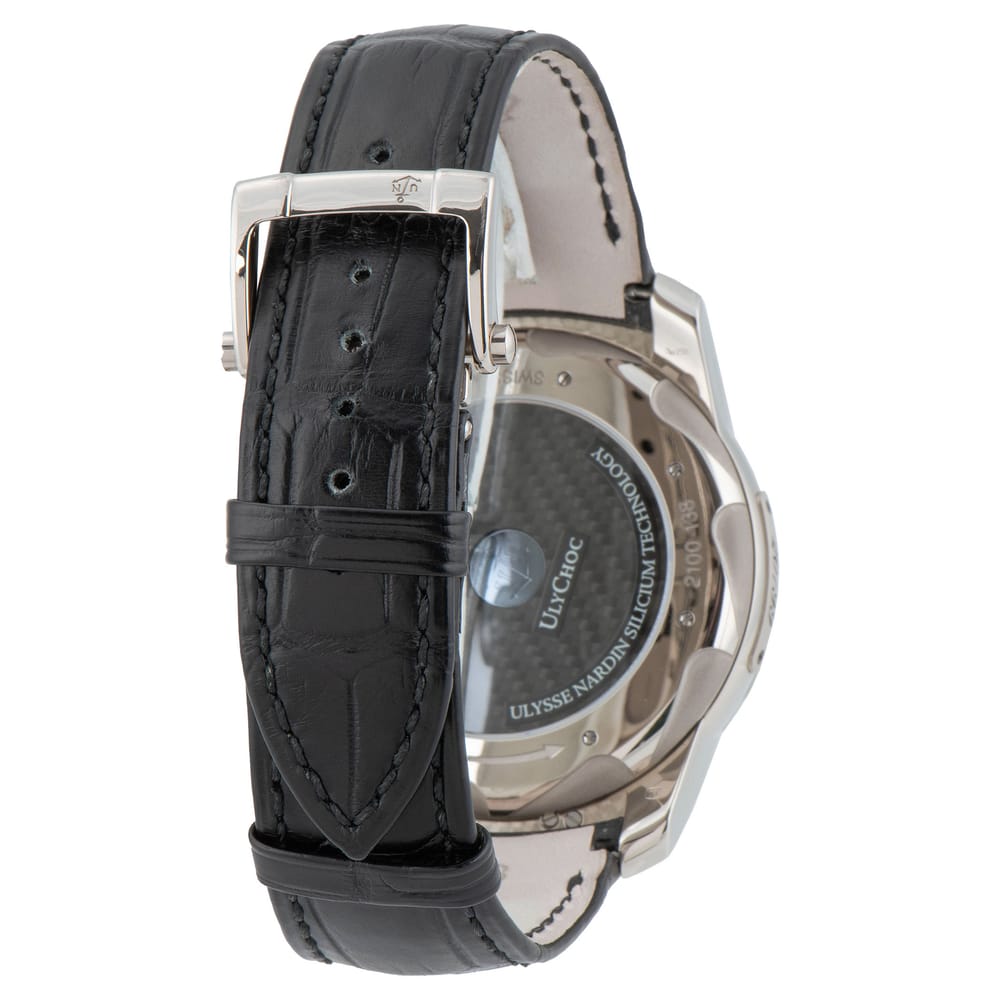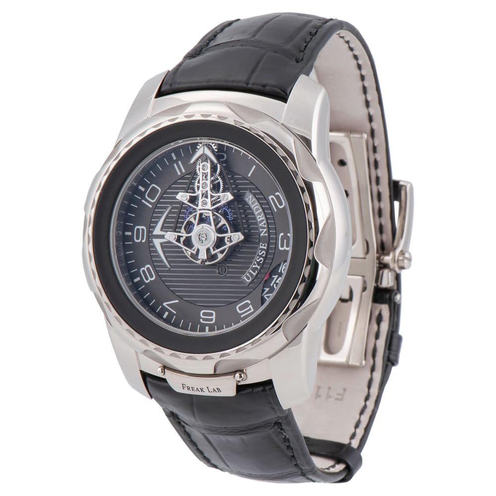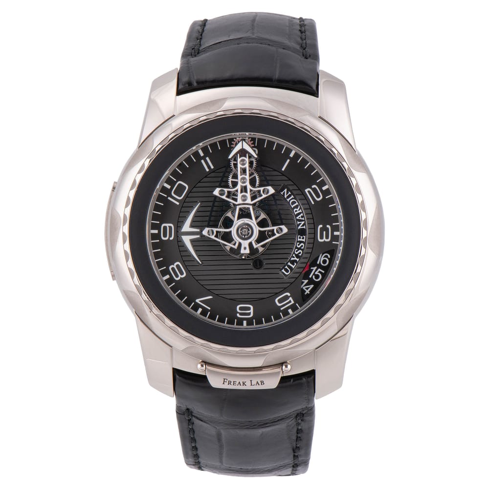 The Ulysse Nardin Freak Lab is a luxurious men’s watch characterized by its bold 45mm blackened titanium case. This exquisite timepiece features a fluted bezel and a striking black dial protected by sapphire crystal. It is powered by the UN-210 caliber, providing an impressive 168-hour power reserve and a practical date complication. The black leather strap complements its design, making it a perfect choice for formal occasions.